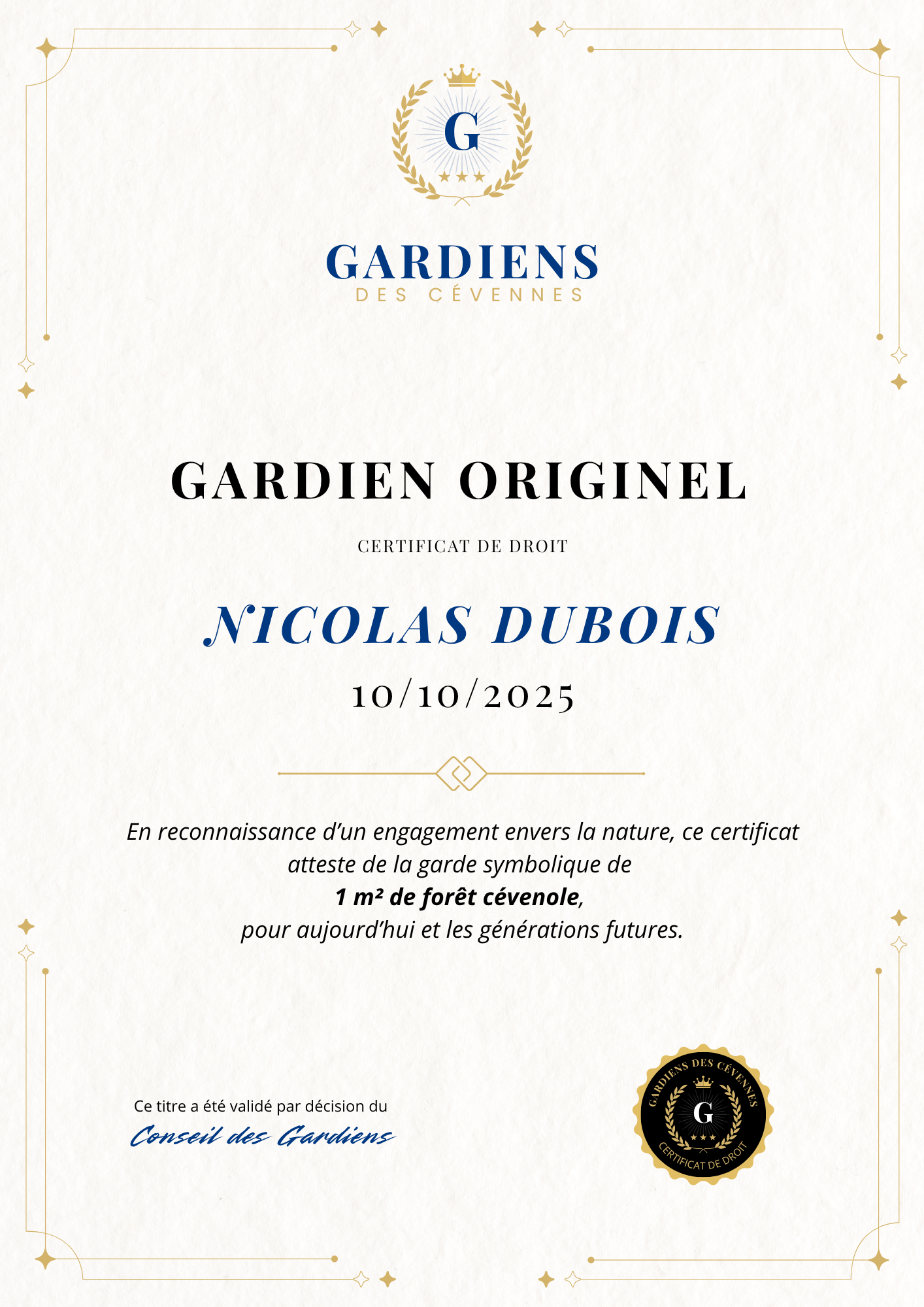 - Un certificat personnalisé, avec le nom du ou de la Gardienne